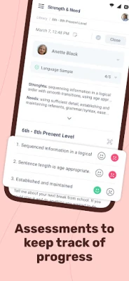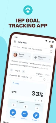 1. IEP Goal Tracking - collect data on IEP goals with a single click. 10+ data types to choose from 2. Graphs and Reports - beautiful reports and graphs automatically generated for your next IEP meeting 3. Collaboration - work alongside other clinicians & assistants, securely share & collect data in a team 4. Assessments - progress monitoring assessments ensure objective data on student skills is always available 5. Scheduling - set up your daily schedule 6. Medicaid Billing - automatically generate Medicaid billing notes 7. Materials & Community - a built-in materials library and a community of helpful professionals