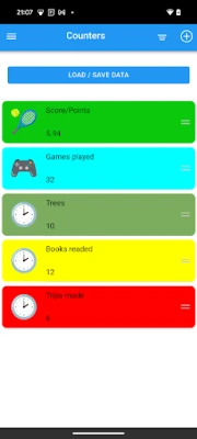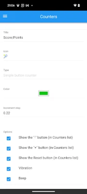 The values of the accounts can be changed after the main screen. There is a Plus, Minus and Reset button. The counters are configurable, it is possible to emit a beep and vibrations each time you press the button. The data is exportable in Json format and chargeable to other devices.